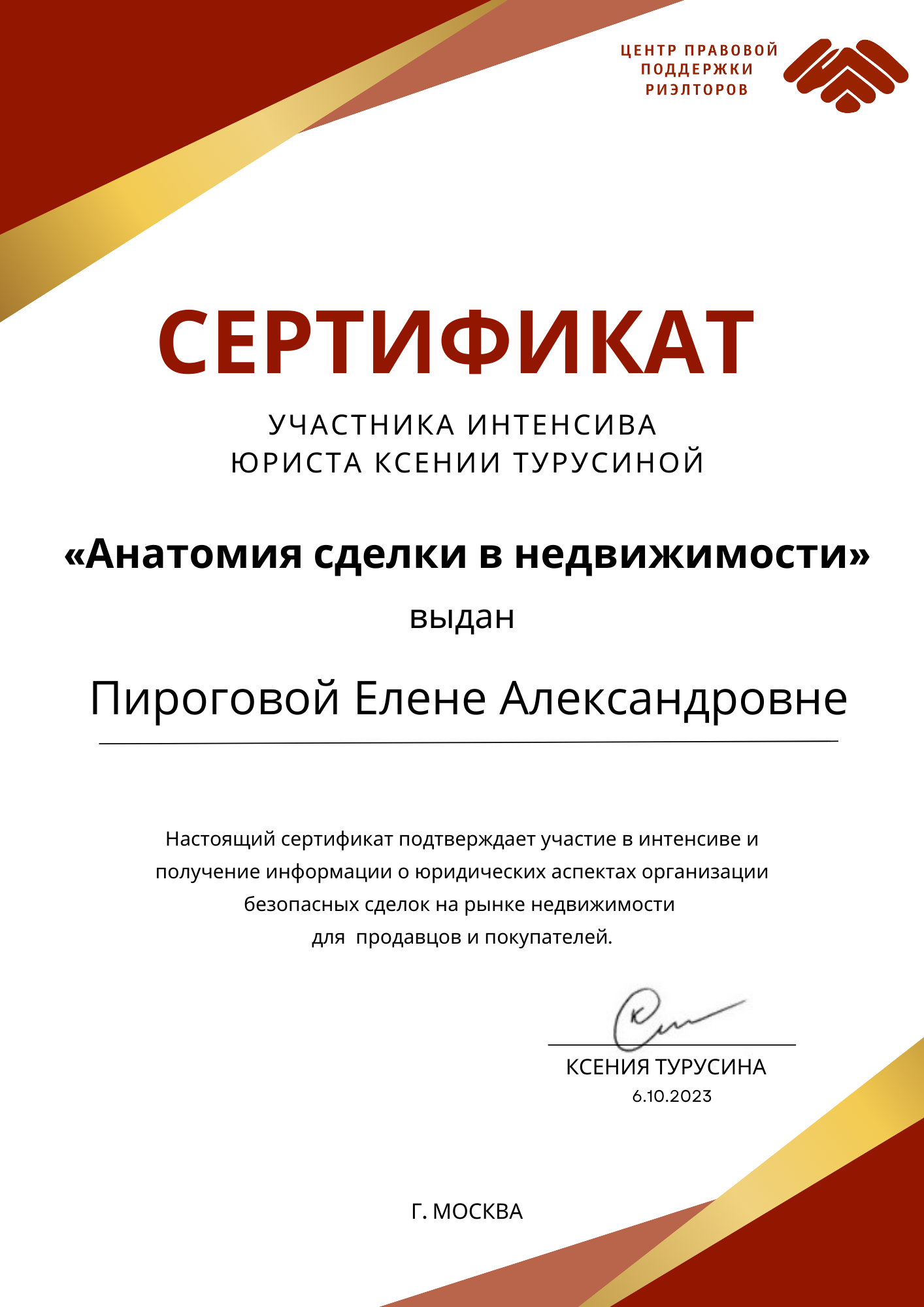 Огромное спа́сибо риэлтор Елена Пирогова Вы грамотный специалист,при проведении сделки все возникающие проблемы решались быстро и грамотно.Успехов в Вашей работе,здоровья семейного благополучия.