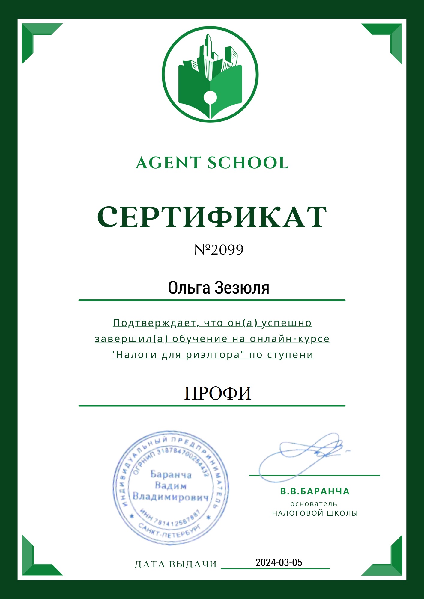 Большое спасибо Зезюля Ольге, за компетентность, внимательность и отзывчивость, за полностью взятые на себя организационно-технические, юридическо-правовые вопросы связанные с поиском клиентов, подготовкой всех необходимых документов и совершении самой сделки. Вела нас от начала до конца. Были различные трудности, сами бы не справились. Рекомендую!!!