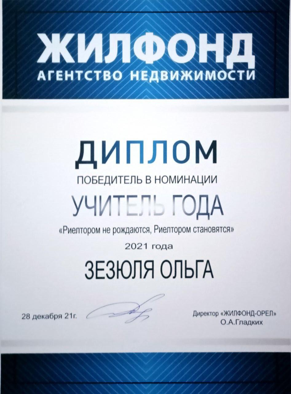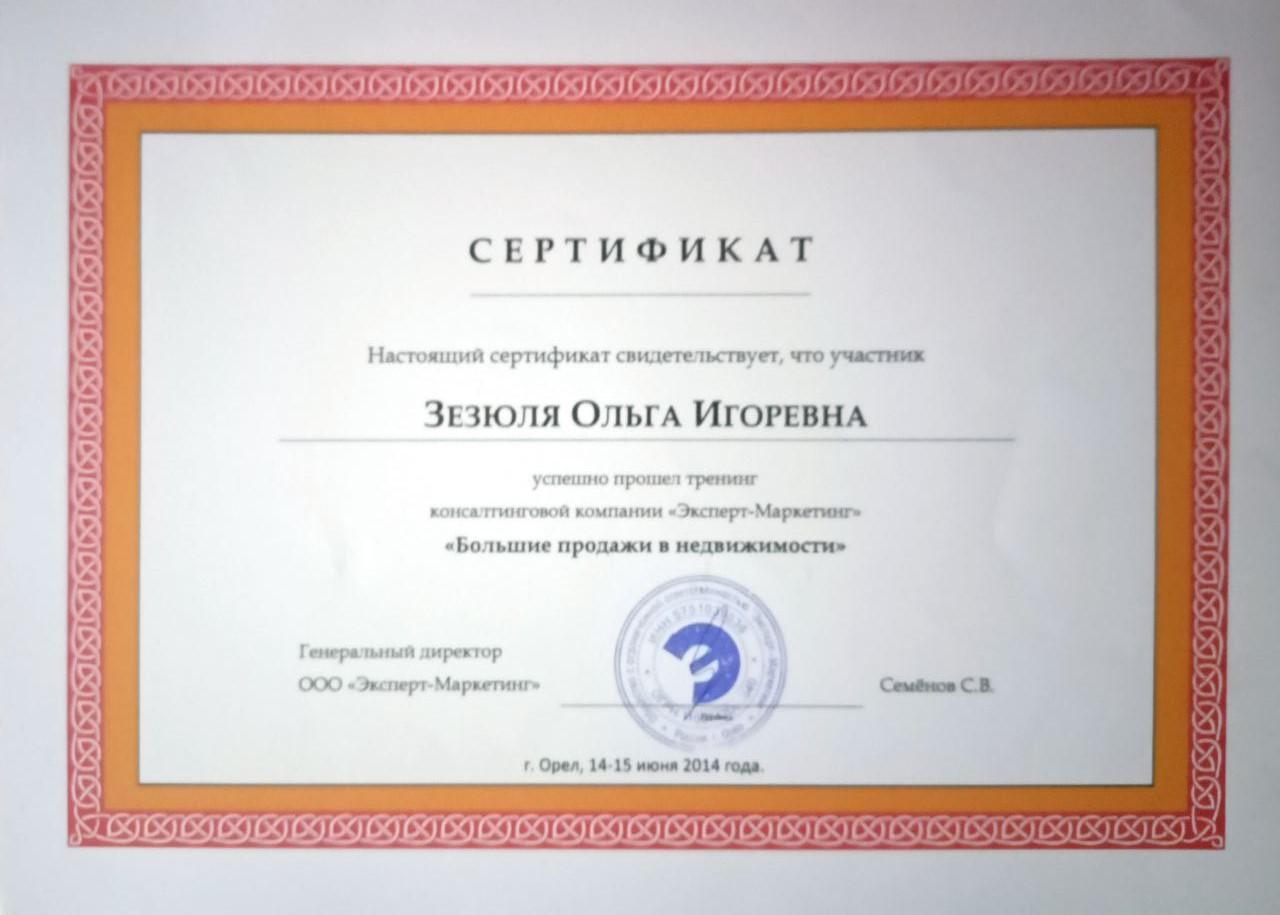 Выражаю огромную благодарность Зезюля Ольге за помощь в продаже квартиры. Учитывая тот факт, что квартира находилась в Орле, а сам продавец находился за тысячи километров, кроме того, столкнулся впервые с необходимостью совершения сделки с недвижимостью, то присутствовало некое волнение - как всё получится. Но, в итоге всё получилось, и довольно быстро, как нельзя лучше, и в этом огромная заслуга Ольги Игоревны, профессионала своего дела и огромной души человека. У неё с самого начала заключения договора не было никаких сомнений, и она нас в этом тоже убеждала, что всё будет хорошо, чтобы мы не волновались. Ольга Игоревна постоянно была с нами на связи, согласовывала с нами все возникающие вопросы и предложения со стороны покупателя. Побольше бы таких специалистов, как Ольга Игоревна! Желаю успехов в работе и благодарных клиентов! Очень рекомендую всем, кому нужна помощь в совершении сделки с недвижимостью, именно этого Специалиста с большой буквы.